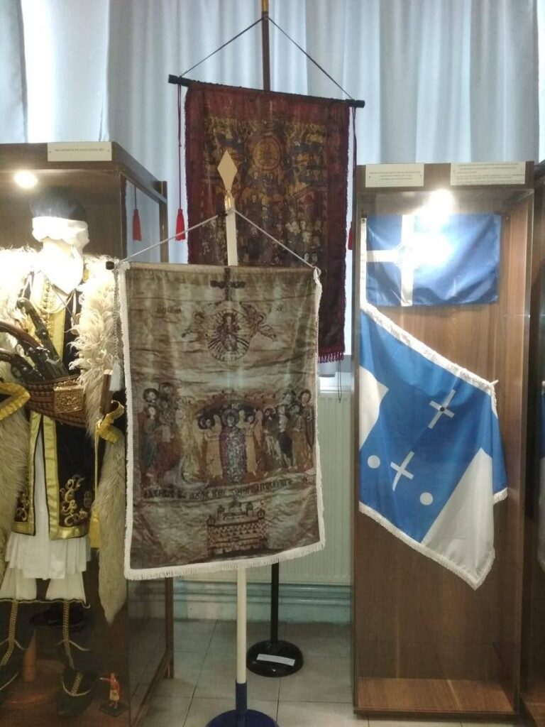 Ανάμεσα στα 820 εκθέματα παρουσιάζονται λάβαρα και σημαίες της εποχής του Μακεδονικού αγώνα, ομοιώματα σφραγίδων, στολές, οπλισμός Μακεδονομάχων, 180 σημαίες περιοχών της Ελλάδος κατά την Επανάσταση του 1821 κα.