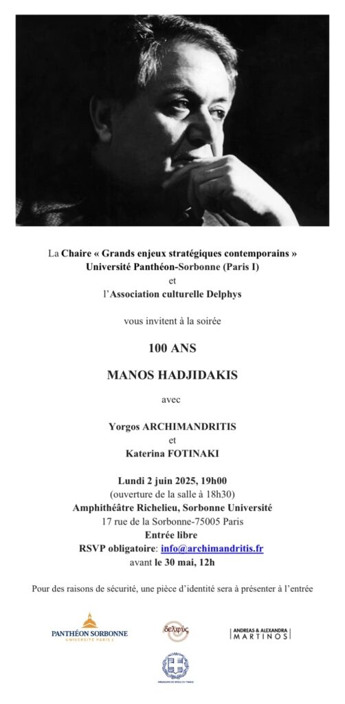 La Chaire « Grands enjeux stratégiques contemporains » de l’Université Panthéon-Sorbonne (Paris I) et l’association culturelle Delphys vous invitent à une soirée spéciale pour célébrer les 100 ans de Manos Hadjidakis. L’événement aura lieu le lundi 2 juin 2025 à 19h00 à l’Amphithéâtre Richelieu, Sorbonne Université (17 rue de la Sorbonne, 75005 Paris).