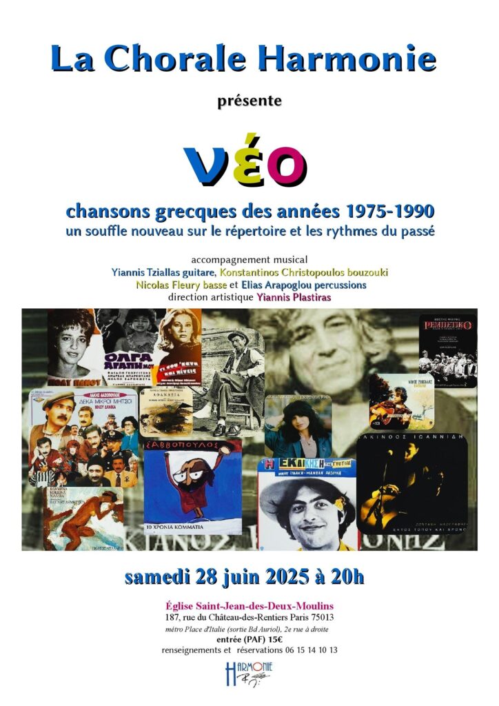 Venez découvrir le programme du concert que vous a concocté la Chorale Harmonie*, autour du « νέο » qui a fleuri pendant cette période d’une quinzaine d’années où, après les sombres années de la guerre civile puis de la Dictature des colonels, la jeunesse grecque , nourrie d’espoir et de rock , renoue avec des traditions musicales populaires délaissées, et leur donne un souffle nouveau en redécouvrant, renouvelant et réinterprétant le rebetiko, l’ancien laïko, les chansons traditionnelles, et les rythmes populaires associés à la danse : c’est la période du neo-rebetiko, neo laïko, neo-paradosiako…