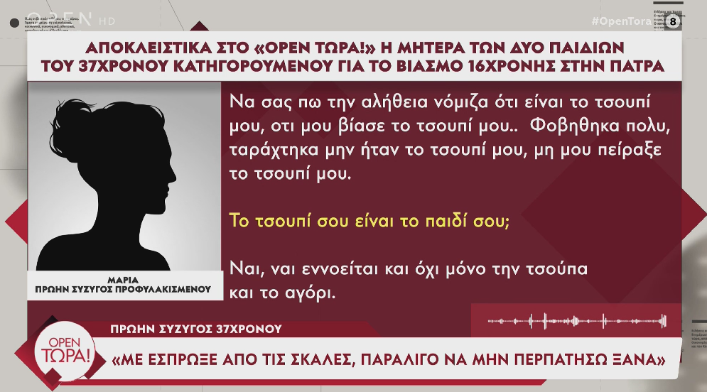 Στο “OPEN ΤΩΡΑ” μίλησε η δικηγόρος της μητέρας, η οποία θορυβήθηκε μετά το περιστατικό της 16χρονης. Η μητέρα είχε παρατηρήσει κάποια αλλαγή στη συμπεριφορά του παιδιού. Η ίδια ρώτησε το παιδί αν έχει συμβεί κάτι. Η 8χρονη φέρεται να έγραψε σε χειρόγραφο σημείωμα ότι δέχθηκε άγγιγμα στο σώμα της. Μετά από αυτό, η μητέρα της 8χρονης κατήγγειλε το γεγονός στην αστυνομία.