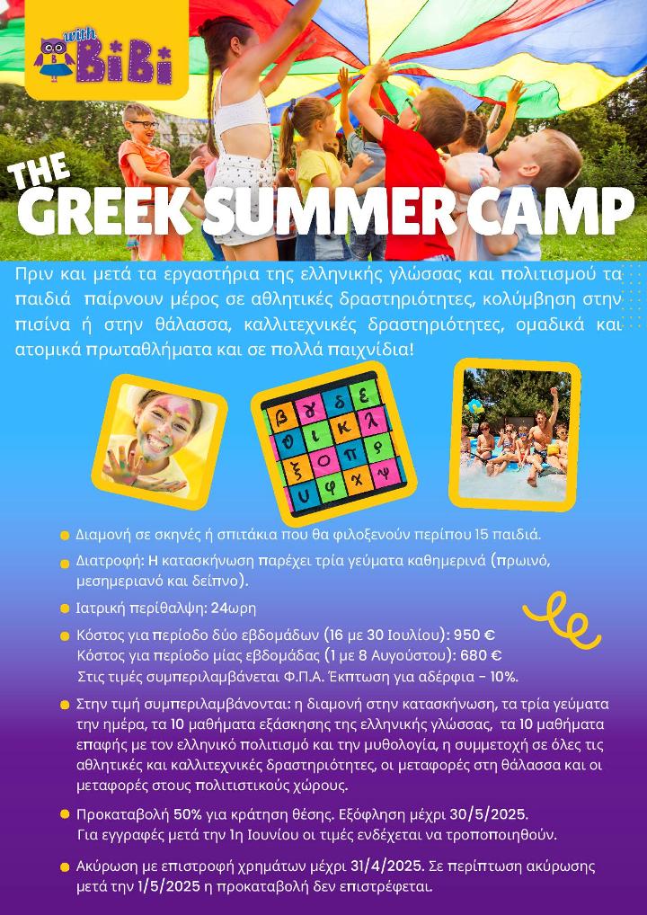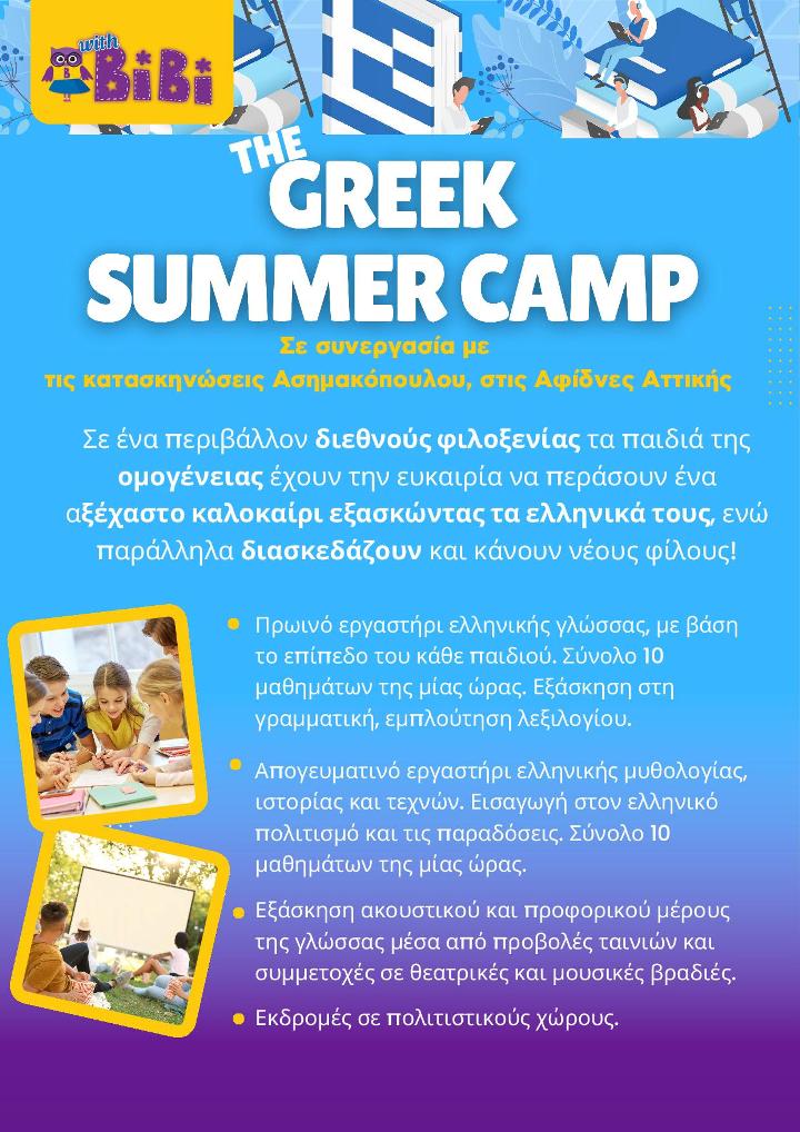 Το πρόγραμμα έχει σχεδιαστεί με σκοπό να προσφέρει στα παιδιά μια αξέχαστη εμπειρία, ενισχύοντας παράλληλα την επαφή τους με την ελληνική ταυτότητα. Η κατασκήνωση βρίσκεται μία ώρα περίπου έξω από την Αθήνα, στις Αφίδνες Αττικής. Στο επισυναπτόμενο αρχείο μπορείτε να δείτε πιο πολλές λεπτομέρειες.