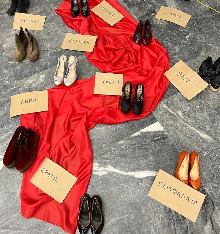 Σημείο αναφοράς και μνήμης στην αίθουσα «Μανόλης Αναγνωστάκης», τα παπούτσια των γυναικών που δολοφονήθηκαν από τους συντρόφους τους. 10 ζευγάρια παπούτσια πάνω σε ένα κόκκινο ύφασμα, συμβολικό για το άδικο αίμα των γυναικών που χύθηκε, που κάποιοι αποφάσισαν με δόλο να αφαιρέσουν τόσο βίαια τη ζωή τους. Η Καρολάιν, η Ενκελέιντα, η Νεκταρία, η Κυριακή, η Ελένη, η Όλγα, η Άννα, η Ερατώ, η Γαρυφαλλιά…η λίστα δυστυχώς δεν τελειώνει με αυτά τα ονόματα….