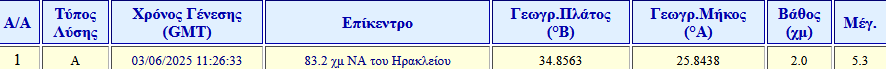 The earthquake occurred in the sea off Lassithi and the focal depth is estimated at 10km.