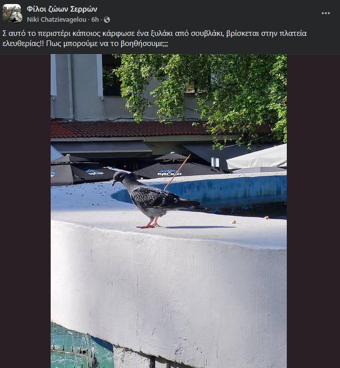 Όπως φαίνεται και στη φωτογραφία κάποιος ανόητος κάρφωσε ένα ξύλο από σουβλάκι σε ένα περιστέρι. Το περιστέρι με το ξύλο καρφωμένο στο σώμα του στεκόταν στο συντριβάνι της πλατείας.