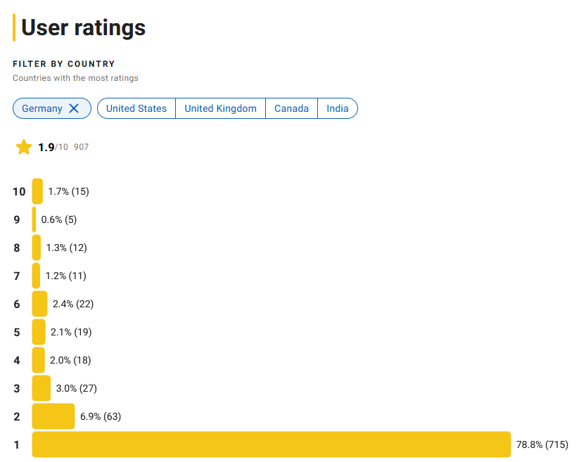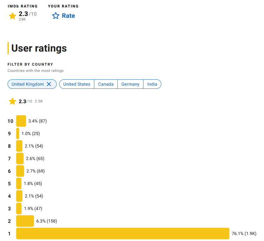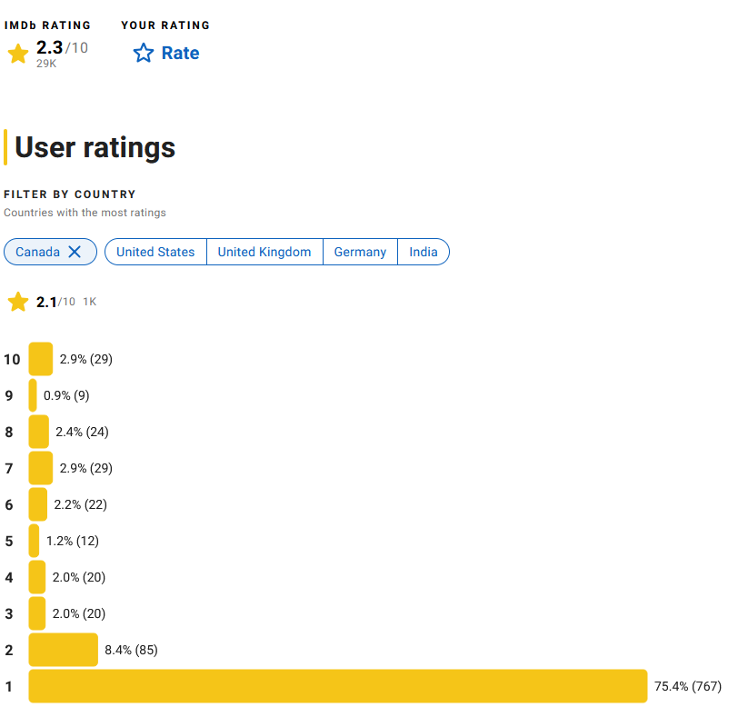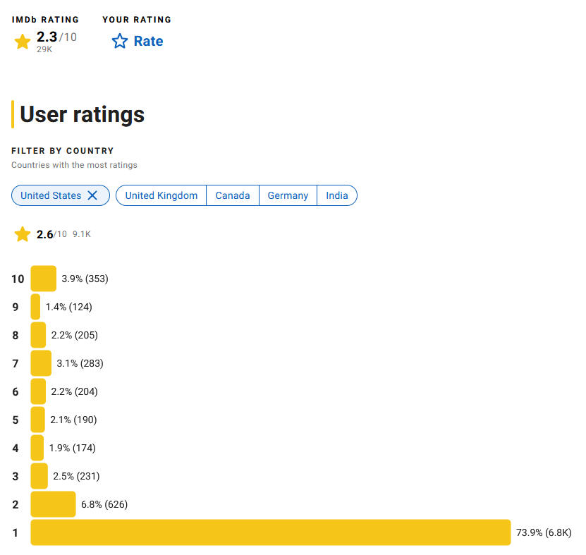 In United States “Snow White” got so far a 2.6/10, in UK a 2.3/10, in Canada a 2.1/10 and in Germany (homeland of the Grimm brothers) a 1.9/10!