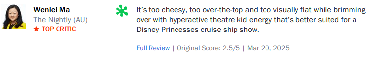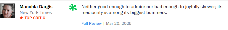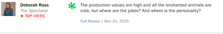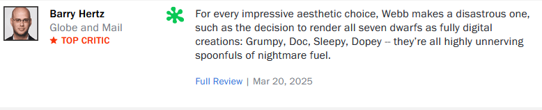 On Rotten Tomatoes things go a little better for Disney’s “Snow White”. The audience rated the film with a 75% while the film critics gave a 43%. Of particular interest are the comments from top critics on Rotten Tomatoes.