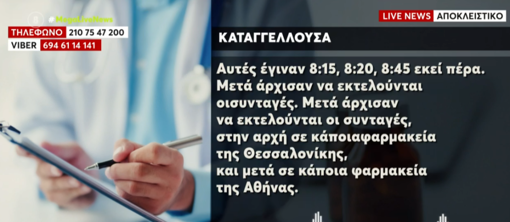Δημοσιογράφος: Έχουν εκτελεστεί οι συνταγές σε φαρμακεία της Θεσσαλονίκης και στην Αθήνα ακόμα και τώρα που μιλάμε μέχρι να εκτελούνται κάποιες συνταγές