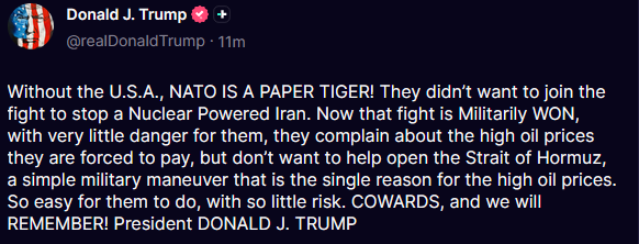 “Χωρίς τις ΗΠΑ, το ΝΑΤΟ ΕΙΝΑΙ ΜΙΑ ΧΑΡΤΙΝΗ ΤΙΓΡΗ! Δεν ήθελαν να συμμετάσχουν στον αγώνα για να σταματήσουν ένα πυρηνικό Ιράν. Τώρα που η μάχη ΚΕΡΔΙΘΗΚΕ στρατιωτικά, με πολύ μικρό κίνδυνο για αυτούς, παραπονιούνται για τις υψηλές τιμές πετρελαίου που αναγκάζονται να πληρώσουν, αλλά δεν θέλουν να βοηθήσουν στο άνοιγμα του Στενού του Ορμούζ, έναν απλό στρατιωτικό ελιγμό που είναι ο μοναδικός λόγος για τις υψηλές τιμές του πετρελαίου. Τόσο εύκολο για αυτούς να το κάνουν, με τόσο μικρό κίνδυνο. ΔΕΙΛΟΙ, και θα το ΘΥΜΟΜΑΣΤΕ! Πρόεδρος ΝΤΟΝΑΛΝΤ ΤΖ. ΤΡΑΜΠ”.