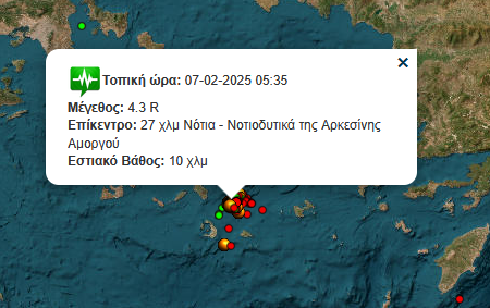 Συγκεκριμένα από τις 05:33 μέχρι τις 06:29 σημειώθηκαν 5 σεισμοί άνω των 3 Ρίχτερ με τον μεγαλύτερο σεισμό σε μέγεθος 4.3 R να καταγράφεται στις 05:35 στον θαλάσσιο χώρο νότια της Αμοργού, σύμφωνα με το Γεωδυναμικό Ινστιτούτο του Εθνικού Αστεροσκοπείου της Αθήνας.