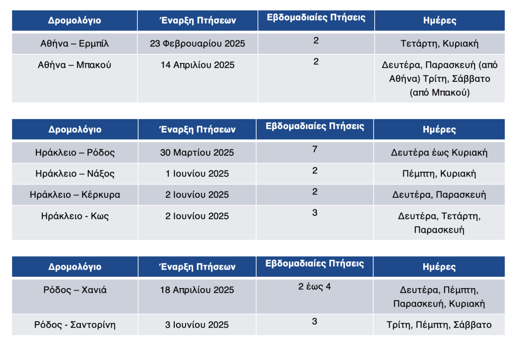 Υπενθυμίζεται ότι η AEGEAN ήδη από τον Οκτώβριο του 2024 έχει ενισχύσει τη δραστηριότητά της και στα υπάρχοντα δρομολόγια από Αθήνα προς Κωνσταντινούπολη (4 καθημερινά δρομολόγια) και προς Σμύρνη (5 εβδομαδιαία δρομολόγια) αντίστοιχα, ενώ με την έναρξη του θερινού προγράμματος 2025 προσθέτει νέες απευθείας πτήσεις από Ηράκλειο, Μύκονο, Ρόδο και Σαντορίνη προς Κωνσταντινούπολη. Πιο συγκεκριμένα, από τον Απρίλιο του 2025 και καθ’ όλη τη διάρκεια της καλοκαιρινής περιόδου το Ηράκλειο και η Σαντορίνη θα συνδέονται με την Κωνσταντινούπολη με 2 εβδομαδιαίες πτήσεις, οι οποίες θα αυξηθούν σε 4 την περίοδο αιχμής, ενώ από τον Ιούνιο του 2025 απευθείας πτήσεις από και προς την Κωνσταντινούπολη θα πραγματοποιούνται και από τη Μύκονο και τη Ρόδο (2 εβδομαδιαίες πτήσεις αντίστοιχα).