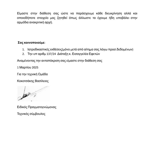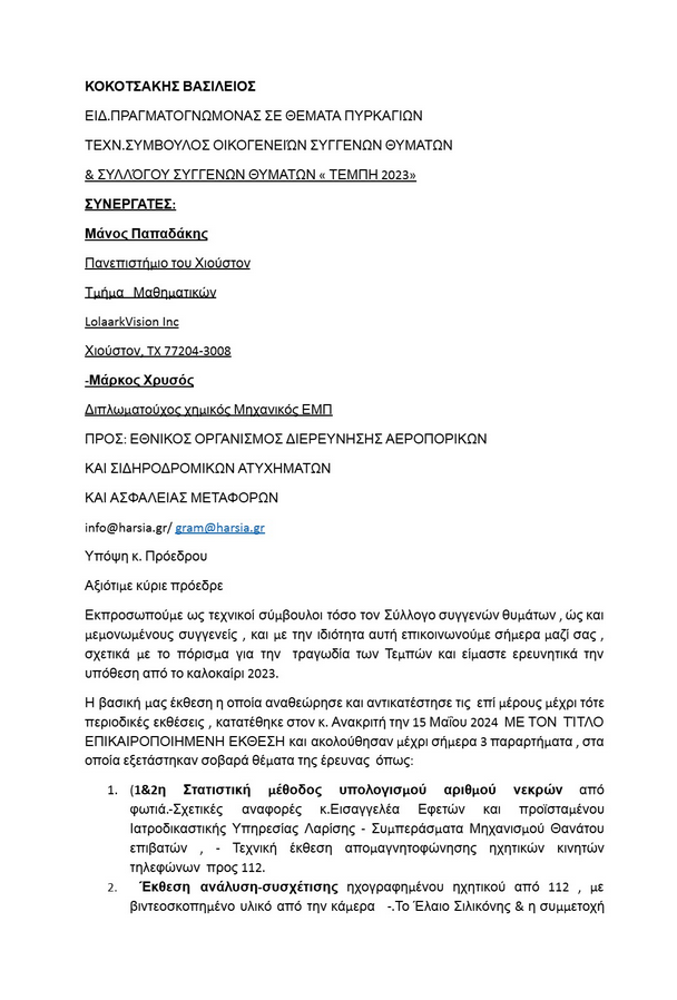Επιστολή απέστειλαν ο ειδικός πραγματογνώμονας Βασίλειος Κοκοτσάκης και ο Σύλλογος Συγγενών θυμάτων “Τέμπη 2023” προς τον Πρόεδρο του Εθνικού Οργανισμού Διερεύνησης Αεροπορικών και Σιδηροδρομικών Ατυχημάτων και Ασφάλειας Μεταφορών (ΕΟΔΑΣΑΑΜ), σχετικά με το πόρισμα της Επιτροπής, το οποίο δημοσιοποιήθηκε στις 27 Φεβρουαρίου 2025.