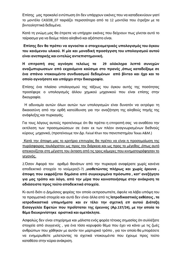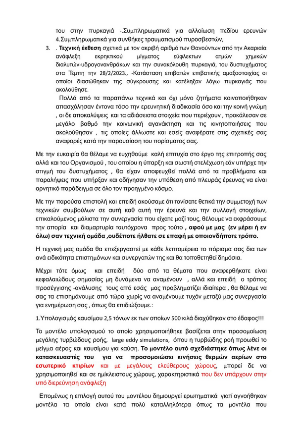 Το περιεχόμενο της επιστολής ανάρτησε στα social media ο κ. Κοκοτσάκης, όπου μεταξύ άλλων υπογραμμίζεται ότι υπάρχουν παραλείψεις και λανθασμένες χρήσης υπολογιστικών μέτρων που αφορούν την πυρόσφαιρα, η οποία δημιουργήθηκε αμέσως μετά τη σύγκρουση της επιβατικής με την εμπορική αμαξοστοιχία στα Τέμπη.