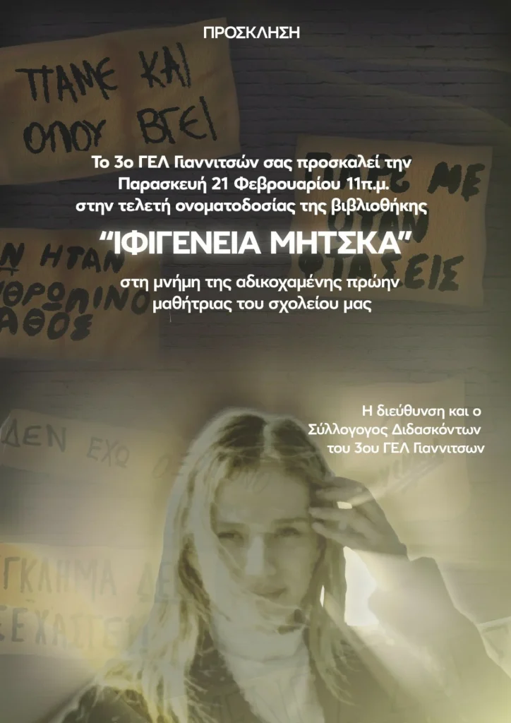 Απονέμοντας τιμή στη μνήμη της μαθήτριάς μας, που φοίτησε στο σχολείο τα έτη 2015-2018, το 3ο ΓΕΛ Γιαννιτσών οργανώνει στις 11 πμ. της Παρασκευής 21.2.2025 τελετή ονοματοδοσίας της βιβλιοθήκης του, «ΙΦΙΓΕΝΕΙΑ ΜΗΤΣΚΑ». Η εκδήλωση θα πλαισιωθεί από ποιήματα που έγραψαν οι μαθητές για το τραγικό δυστύχημα των Τεμπών, μουσική και θεατρικά δρώμενα με την παρουσία παλιών μαθητών, φίλων και συγγενών. Σας καλούμε να μας τιμήσετε με τη συμμετοχή σας. Η Διεύθυνση και ο Σύλλογος Διδασκόντων του 3ου ΓΕΛ Γιαννιτσών.