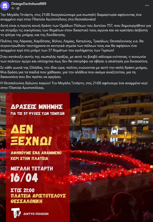 Το βράδυ της Μεγάλης Τετάρτης (16/04) θα πραγματοποιηθεί σιωπηλή διαμαρτυρία για τα 57 θύματα της τραγωδίας των Τεμπών, στο κέντρο της Θεσσαλονίκης.