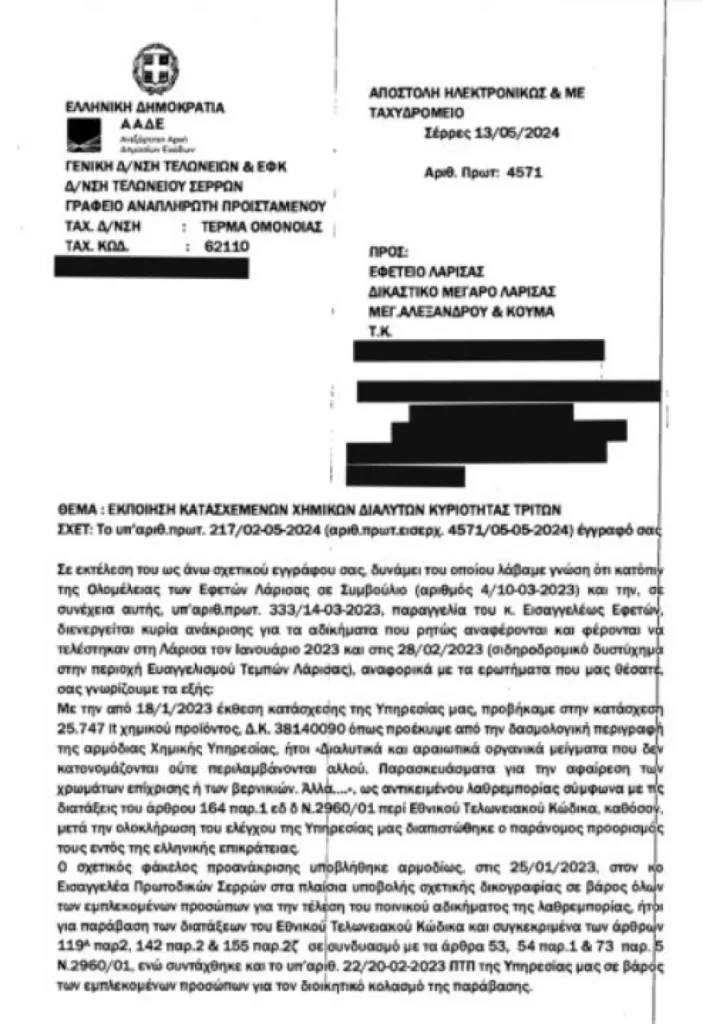 Στα έγγραφα που περιλαμβάνονται και στη δικογραφία για τα Τέμπη, φαίνεται ότι στις 18 Ιανουαρίου 2023 έγινε κατάσχεση από το Τελωνείο Σερρών 25.747 λίτρα χημικών, ως αντικείμενο λαθρεμπορίας, τα οποία στη συνέχεια δημοπρατήθηκαν στις 15 Φεβρουαρίου 2023 και αγοράστηκαν έναντι 15.460 ευρώ από εταιρεία με έδρα το Καλοχώρι Θεσσαλονίκης με αντικείμενο δραστηριότητας την παραγωγή παρασκευασμάτων χρωστικών ουσιών, την παραγωγή χρωμάτων, βερνικιών κ.ά.