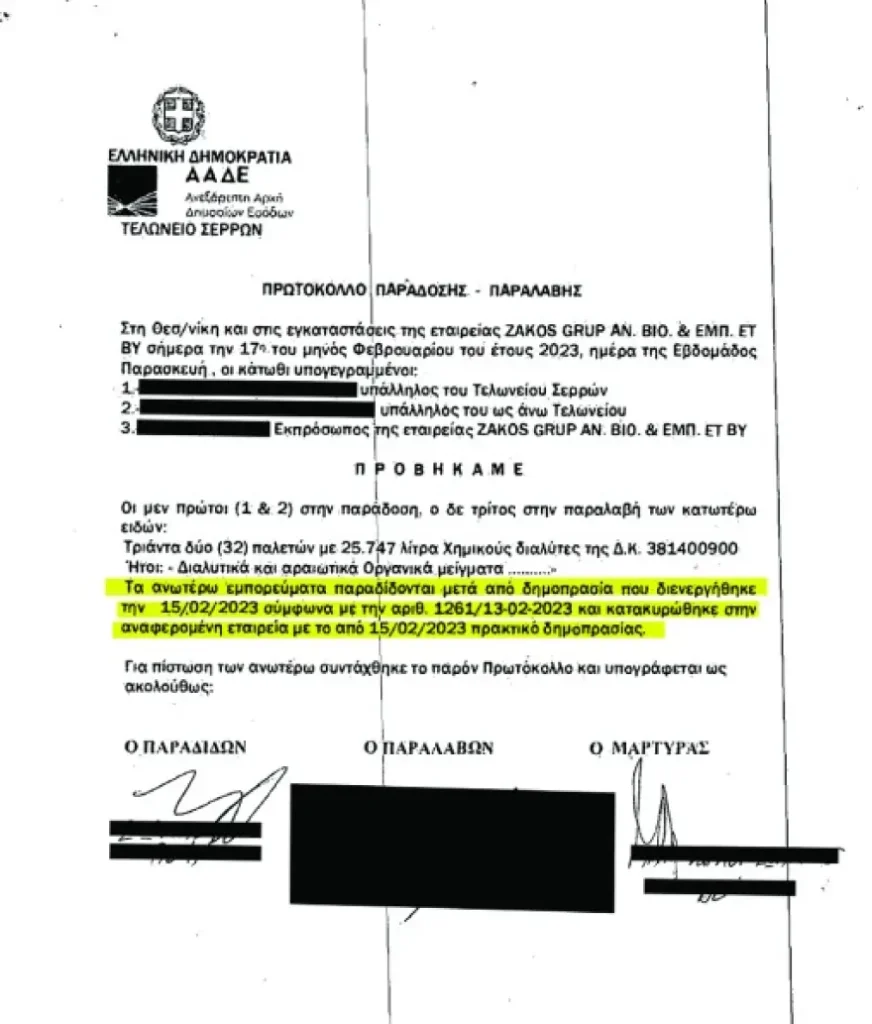 Τέλος, η Γενική Διεύθυνση Τελωνείων ενημερώνει την ανακριτική αρχή ότι «το εμπόρευμα παραδόθηκε από υπαλλήλους της Υπηρεσίας μας στις εγκαταστάσεις της πλειοδότριας εταιρείας …. στις 17/2/2023, όπως προκύπτει από το πρωτόκολλο παράδοσης-παραλαβής που συντάχθηκε». Και καταλήγει αναφέροντας ότι «κατά τους μήνες Ιανουάριο και Φεβρουάριο 2023 η Υπηρεσία μας δεν προέβη σε άλλη εκποίηση χημικών διαλυτών».