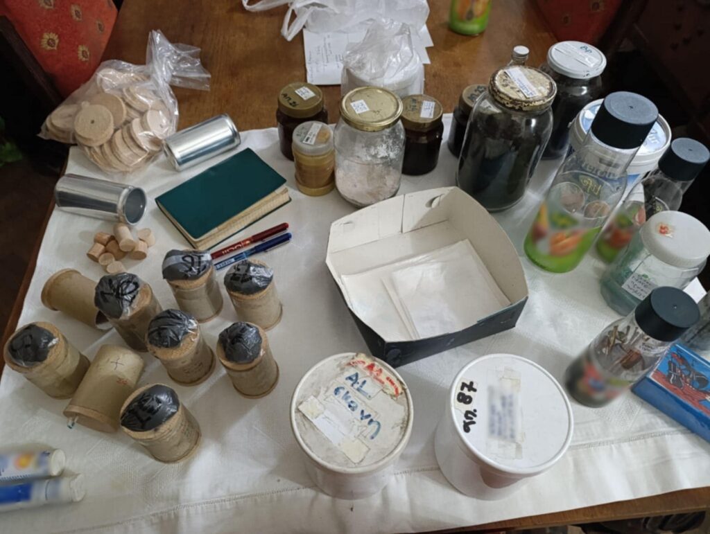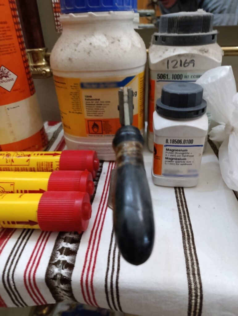 - μεγάλες ποσότητες υλικών που σχετίζονται με την παρασκευή πυρίτιδας, καθώς και πολυάριθμες συσκευασίες που περιείχαν είτε έτοιμη μαύρη πυρίτιδα (πλέον των 13 κιλών), είτε πρόδρομες χημικές ουσίες όπως νιτρικό κάλιο, θείο, ξυλάνθρακα, σκόνες μετάλλων (αλουμινίου, μαγνησίου), υγρά χημικά όπως μεθανόλη, διαιθυλαιθέρας,