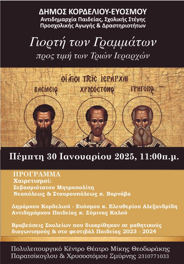 Αφιερωμένη στο έργο και τις αξίες που κληροδότησαν στη σύγχρονη ανθρωπότητα οι φωτισμένοι Πατέρες της Ορθοδοξίας και της Παιδείας, οι Τρεις Ιεράρχες, είναι η εκδήλωση που διοργανώνει ο Δήμος Κορδελιού – Ευόσμου την Πέμπτη 30 Ιανουαρίου 2025 στις 11.00 πμ στο Πολυλειτουργικό Κέντρο – Θέατρο “Μίκης Θεοδωράκης” (οδός Παρατσίκογλου 1, είσοδος από Μοναστηρίου, Ελευθέριο Κορδελιό).