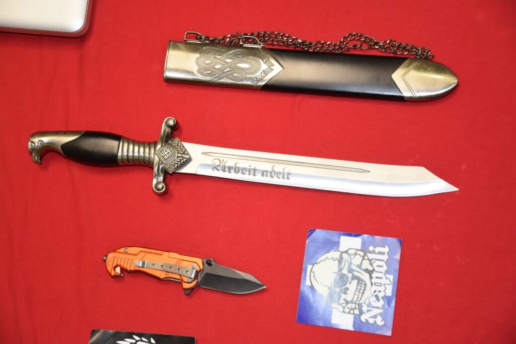 Σε έρευνες που πραγματοποιήθηκαν βρέθηκαν και κατασχέθηκαν εθνικιστικά σύμβολα και όπλα (σιδηρογροθιές, μαχαίρια, σπαθί, ράβδοι κ.ά.)