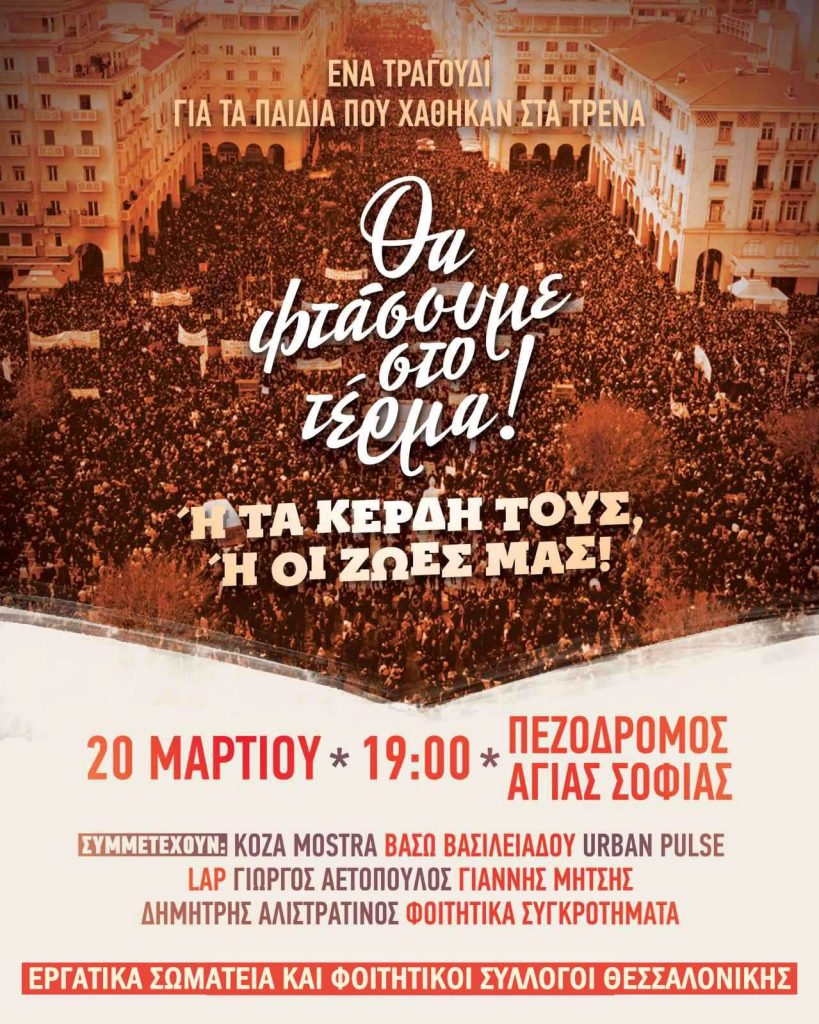 Συναυλία – διαμαρτυρία για την τραγωδία των Τεμπών θα πραγματοποιηθεί σήμερα στις 19.00 στον πεζόδρομο της Αγίας Σοφίας, στο κέντρο της Θεσσαλονίκης.