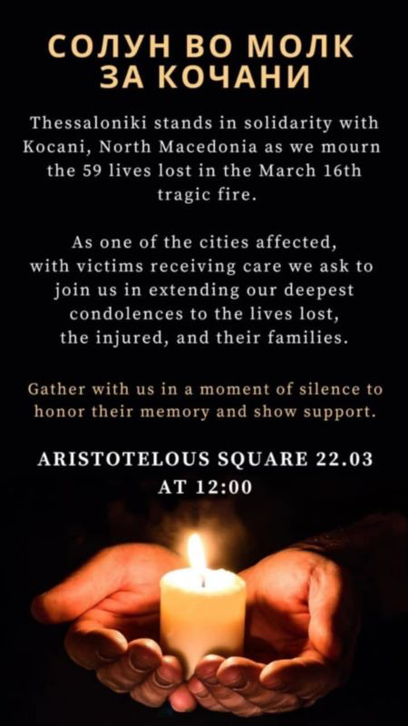 Επίσης, στις 12.00, στην πλατεία Αριστοτέλους, φοιτητές από τα Σκόπια που σπουδάζουν στη Θεσσαλονίκη, καλούν σε συγκέντρωση στη μνήμη των 59 νεαρών θυμάτων της φονικής πυρκαγιάς στο παράνομο κλαμπ στην κωμόπολη Κότσανι.