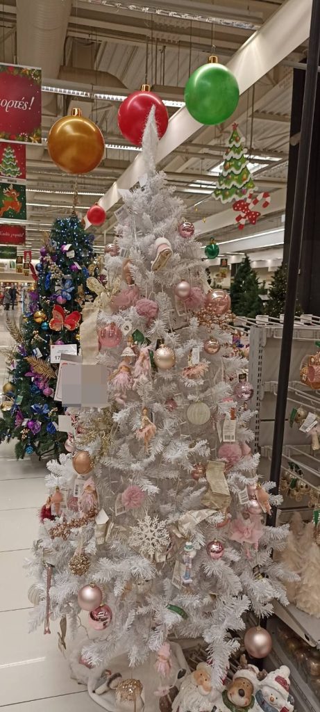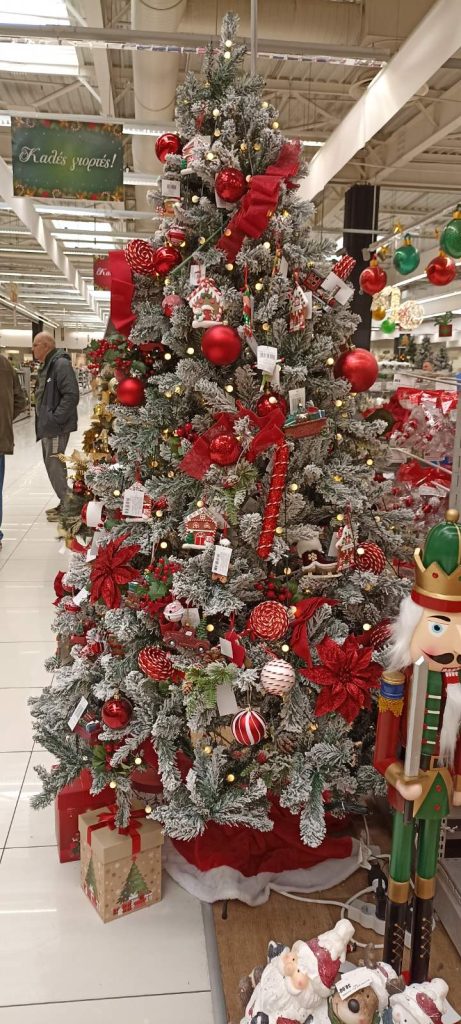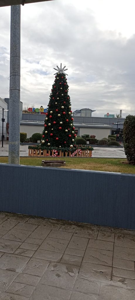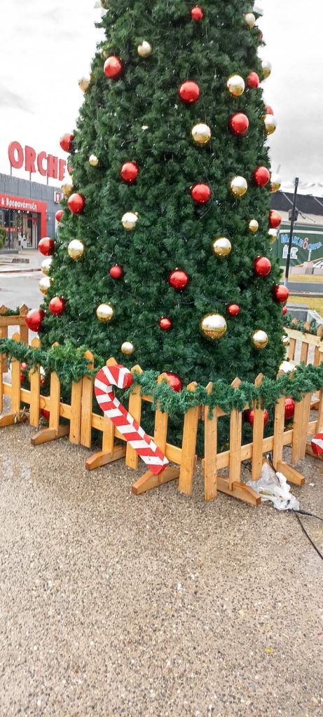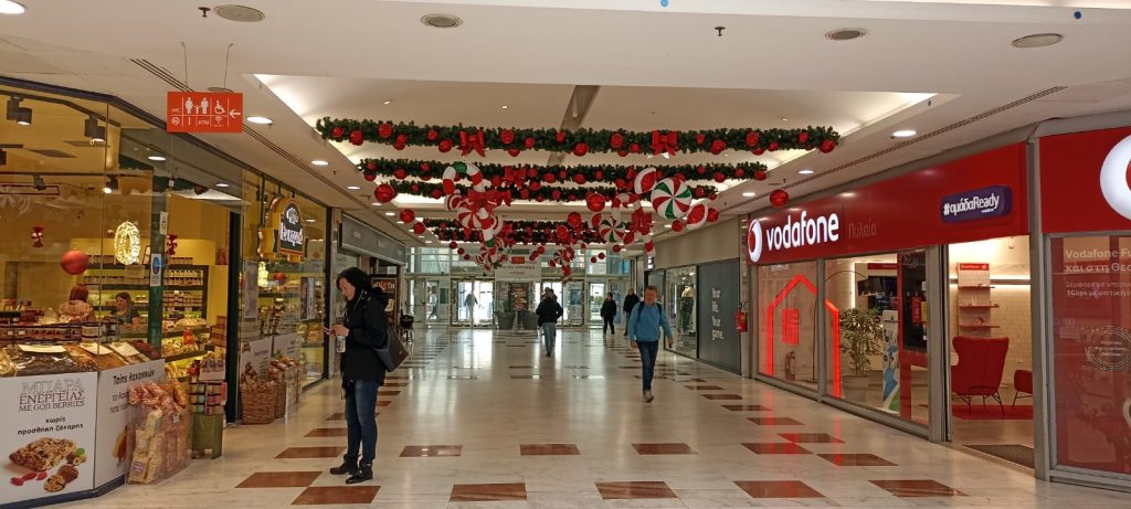 This time going east, we found ourselves at Makedonia Mall, a multipurpose facility that houses indoor and outdoor cafeterias, restaurants, shops, cinemas, supermarkets, etc. And the first Christmas tree with gold and red ornaments welcomed us.