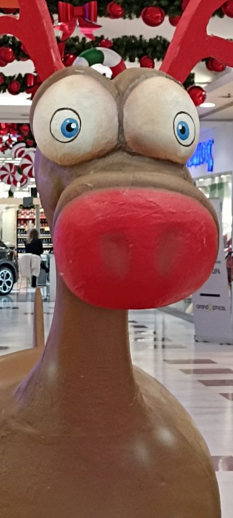 In one of the alleys stands the famous deer Rudolf with his shiny red noise.