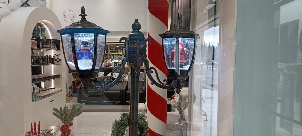One of the most beautiful christmas decorations that we have seen so far, was this street light where a snowman and a Santa Claus are enjoying the snowfall inside the lamps.