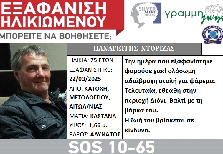 Silver alert έχει εκδοθεί για την εξαφάνιση του 75χρονου ψαρά, Παναγιώτη Ντόριζα, που αγνοείται από τις 22/03/2025 από την Κατοχή Μεσολογγίου.