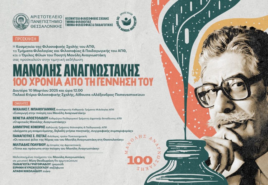 «Μανόλης Αναγνωστάκης: 100 χρόνια από τη γέννησή του» είναι ο τίτλος της τιμητικής εκδήλωσης που διοργανώνουν η Κοσμητεία της Φιλοσοφικής Σχολής ΑΠΘ, το Τμήμα Φιλολογίας ΑΠΘ, το Τμήμα Φιλοσοφίας και Παιδαγωγικής ΑΠΘ και ο Όμιλος Φίλων του Ποιητή Μανόλη Αναγνωστάκη, τη Δευτέρα 10 Μαρτίου 2025 και ώρα 12.00, στην Αίθουσα Τελετών του Παλαιού Κτιρίου της Φιλοσοφικής Σχολής του ΑΠΘ.