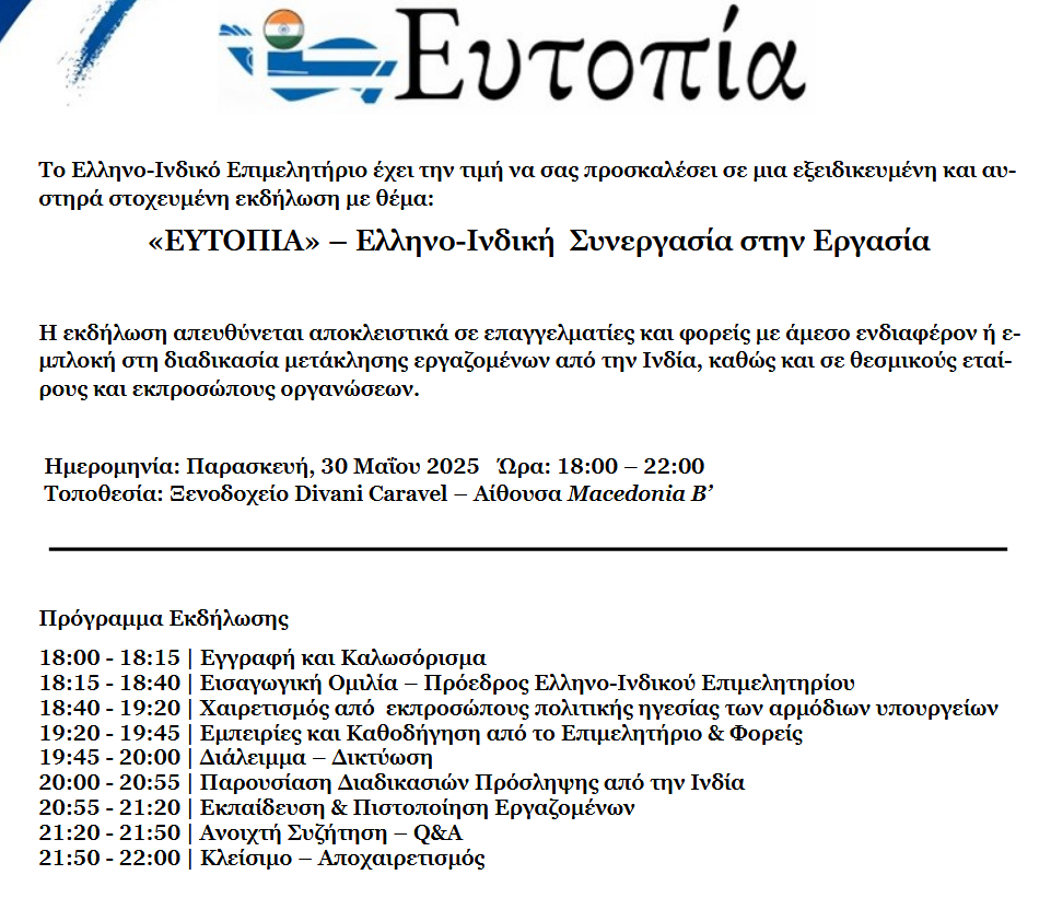 Στο πλαίσιο αυτό, το Ελληνο-Ινδικό Επιμελητήριο παρουσιάζει το πρόγραμμα «ΕΥΤΟΠΙΑ», μια καινοτόμα πρωτοβουλία με ιδιωτικοοικονομικά χαρακτηριστικά, σχεδιασμένη για να δώσει οριστική λύση στις προκλήσεις της ελληνικής αγοράς στην πρόσληψη μετακλητών εργατών.