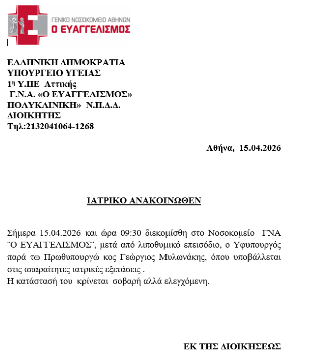Ελλάδα: Σε κρίσιμη κατάσταση εξακολουθεί να νοσηλεύεται ο υφυπουργός παρά τω πρωθυπουργώ, Γιώργος Μυλωνάκης, μετά την χειρουργική επέμβαση στην οποία υποβλήθηκε στο νοσοκομείο «Ευαγγελισμός», λόγω ρήξης ανευρύσματος εγκεφάλου.