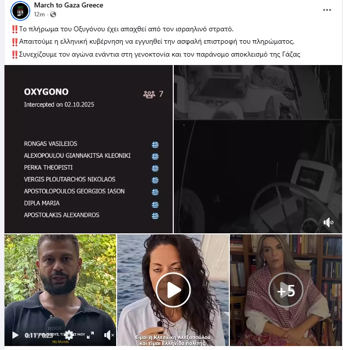 Στόχος του στόλου ήταν να παραδώσει ανθρωπιστική βοήθεια στον παλαιστινιακό θύλακα. Το πλοίο Oxygono δέχτηκε επίθεση με κανόνια νερού από τον ισραηλινό στρατό.Λίγο μετά τις 6.23 το πρωί, το Ισραήλ, εισέβαλε στο ελληνικό πλοίο «ΟΞΥΓΟΝΟ», μεταφέροντας το πλήρωμα «σε άγνωστο μέρος παρά τη θέληση τους». Σε ανάρτησή της στο Facebook, η οργάνωση αναφέρει ότι το πλήρωμα του πλοίου Oξυγόνο έχει απαχθεί και απαιτεί την ασφαλή επιστροφή του πληρώματος.