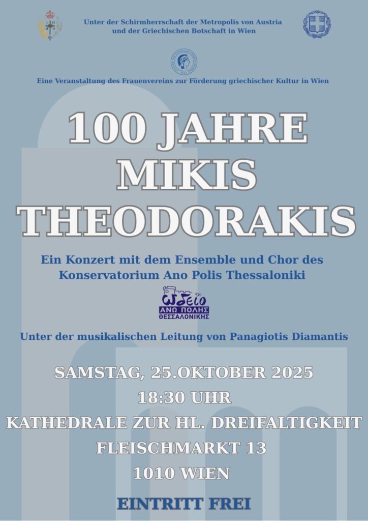 Στο πλαίσιο του Ιωβηλαίου των 100 χρόνων από τη γέννηση του Μίκη Θεοδωράκη, διοργανώνεται συναυλία – αφιέρωμα στον σπουδαίο Έλληνα συνθέτη, το Σάββατο 25 Οκτωβρίου 2025, στις 18:30, στον Καθεδρικό Ναό της Αγίας Τριάδος της Βιέννης, υπό την αιγίδα της Ελληνικής Πρεσβείας της Βιέννης και της Ι.Μητροπόλεως Αυστρίας.