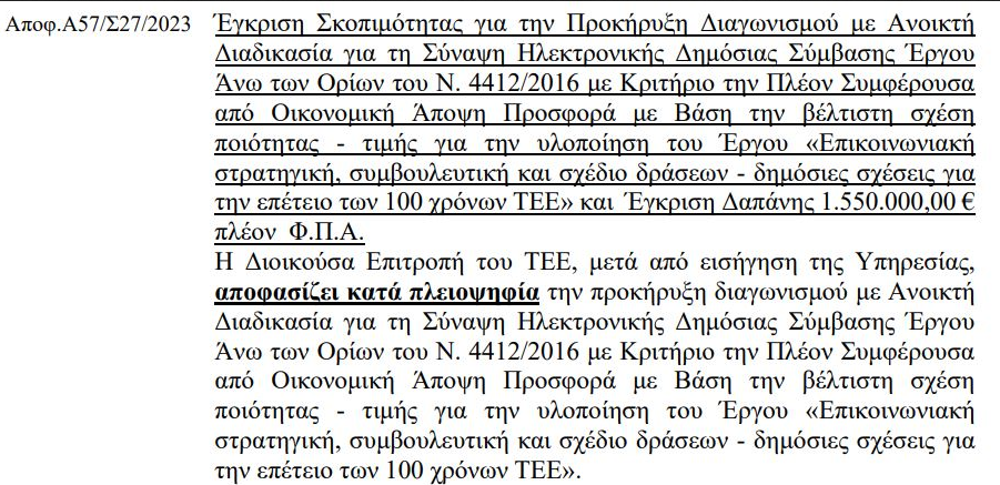 Η απόφαση προχώρησε χωρίς διάλογο, χωρίς ουσιαστική τεκμηρίωση υπέρ της υψηλής δαπάνης, χωρίς διάθεση εξοικονόμησης πόρων, παρόλο που η μειοψηφία κατέθεσε μια ρεαλιστική, χαμηλότερου κόστους πρόταση που κάλυπτε τις επικοινωνιακές ανάγκες του οργανισμού. Το έργο τελικά ανατέθηκε σε εταιρικό σχήμα που σχετίζεται με πρόσωπα τα οποία, σύμφωνα με δημοσιογραφικά ρεπορτάζ, συνδέονται με τους κομματικούς επικοινωνιακούς μηχανισμούς της κυβέρνησης.
