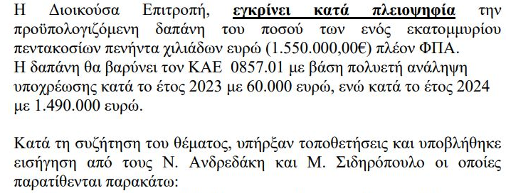 Ιδιαίτερα στην πρώτη συνεδρίαση, την Σ27/2023, στις 8/8/2023, όπου η ΣΥΜΜΑΧΙΑ έθεσε το θέμα για πρώτη φορά και επιχειρηματολόγησε ότι η προτεινόμενη σύμβαση του 1.550.000 ευρώ είναι υπερκοστολογημενη, η ΔΗΣΥΜ αντέκρουσε τους ισχυρισμούς της ΣΥΜΜΑΧΙΑΣ και ψήφισε με αποφασιστικότητα την εισήγηση σκοπιμότητας για την διενέργεια διαγωνισμού με προϋπολογισμό 1.550.000 ευρώ!