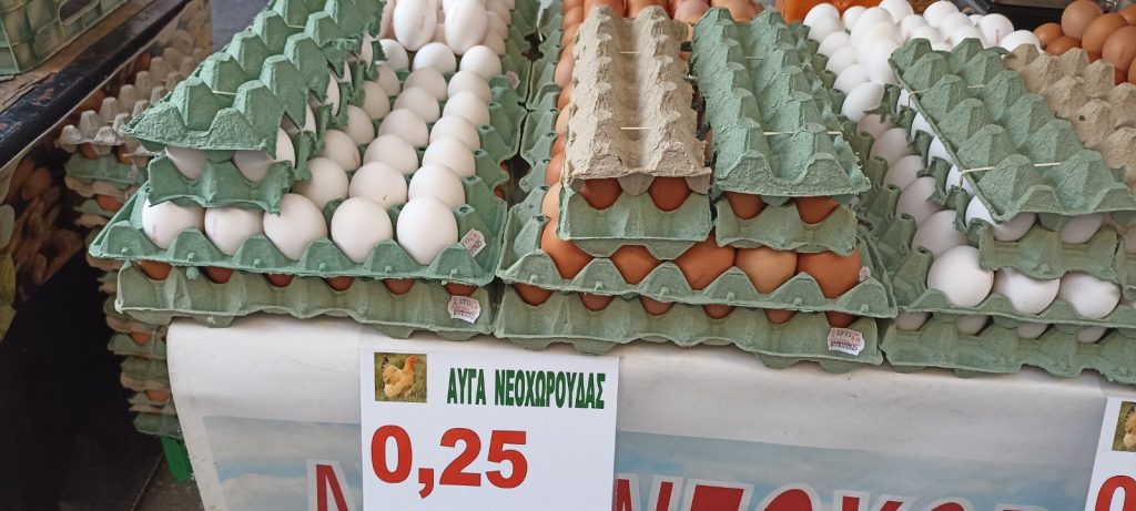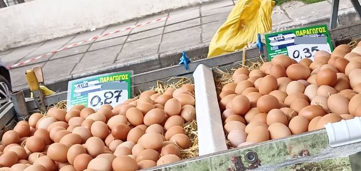 Στα αυγά οι τιμές κυμαίνονται από 0.20 ευρώ το τεμάχιο έως και 0.35 ευρώ το τεμάχιο, ανάλογα το μέγεθος του αυγού.