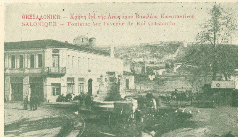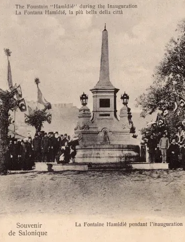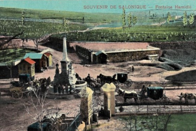 Στην εικόνα – καρτ ποστάλ “souvenir de salonique – Fontaine Hamidie” βλέπουμε το Συντριβάνι, απέναντι από ένα κτήριο, όπου σήμερα στέκει η ΔΕΘ. Η άμαξα με το άσπρο άλογο (δεξιά) στέκει επί της σημερινής οδού Αγγελάκη.
