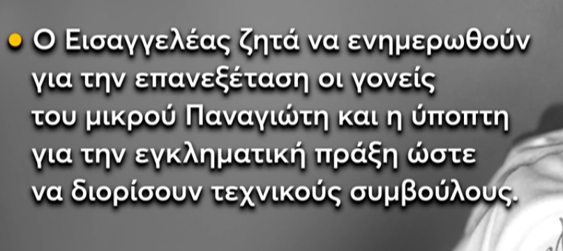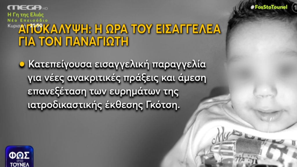 Όπως αποκάλυψε το “Φως στο Τούνελ”, ο φάκελος της υπόθεσης έχει διαβιβαστεί στον Εισαγγελέα με ενδείξεις πλέον ότι ο μικρός Παναγιώτης δολοφονήθηκε και δεν πέθανε ξαφνικά από παθολογικά αίτια. Μάλιστα, θεωρείται ύποπτη εγκλήματος η γυναίκα (Ειρήνη Μουρτζούκου) που βρέθηκε στο επίκεντρο της υπόθεσης.