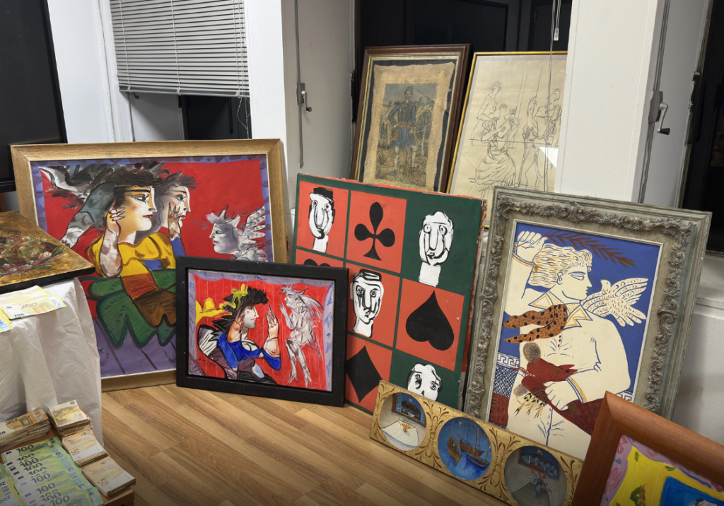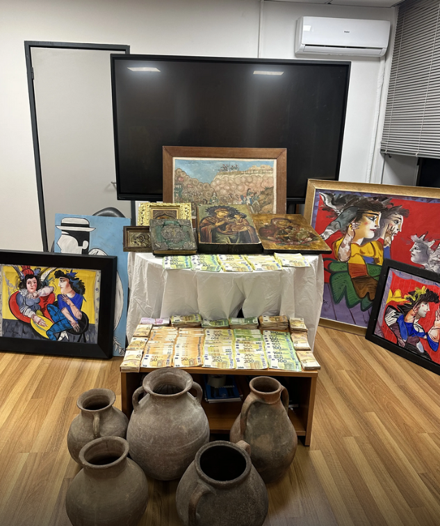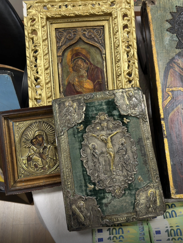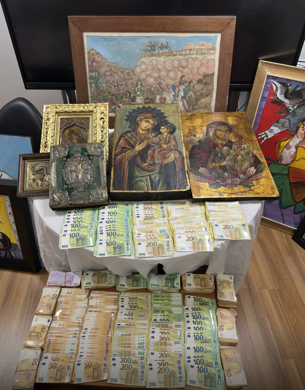 Κατασχέθηκαν, μεταξύ άλλων, -321- έργα τέχνης, -4- αρχαίες εικόνες, Ιερό Ευαγγέλιο, -5- αρχαία αντικείμενα, -226.760- ευρώ, -32.607- δολάρια, περίστροφο και -45- φυσίγγια