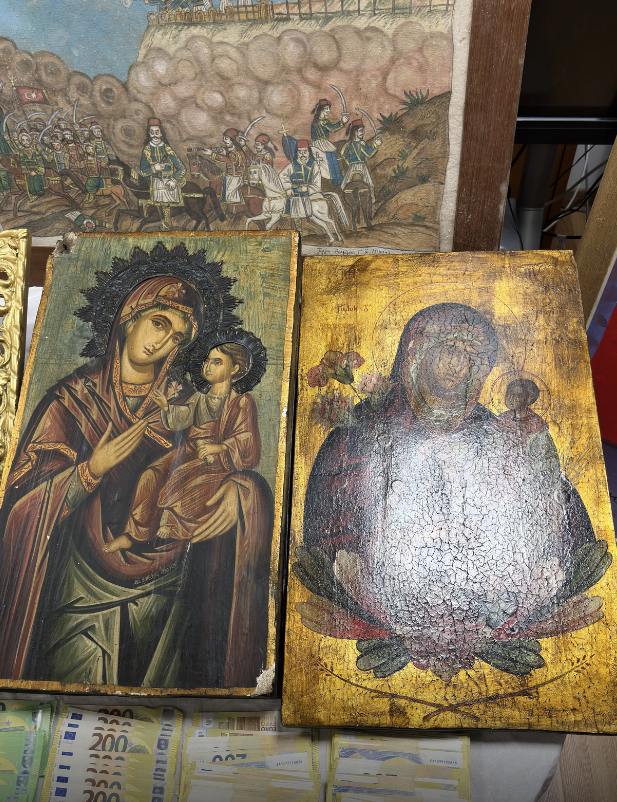 Να σημειωθεί ότι μεταξύ των αντικειμένων που κατασχέθηκαν από την ΕΛ.ΑΣ είναι 321 πίνακες ζωγραφικής, 4 ξύλινες αρχαίες εικόνες, 3 αρχαίοι αμφορείς, 1 Ιερό Ευαγγέλιο, όπως αναφέρεται σε ανακοίνωση της Αστυνομίας.