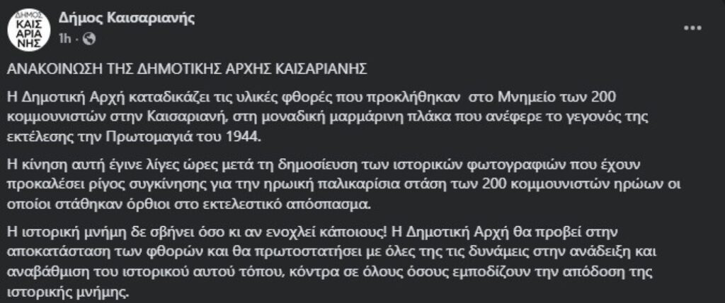 Η Δημοτική Αρχή Καισαριανής εξέδωσε ανακοίνωση με την οποία καταδικάζει απερίφραστα το περιστατικό:«Η Δημοτική Αρχή καταδικάζει τις υλικές φθορές που προκλήθηκαν στο Μνημείο των 200 κομμουνιστών στην Καισαριανή, στη μοναδική μαρμάρινη πλάκα που ανέφερε το γεγονός της εκτέλεσης την Πρωτομαγιά του 1944. Η ιστορική μνήμη δεν σβήνει όσο κι αν ενοχλεί κάποιους.»