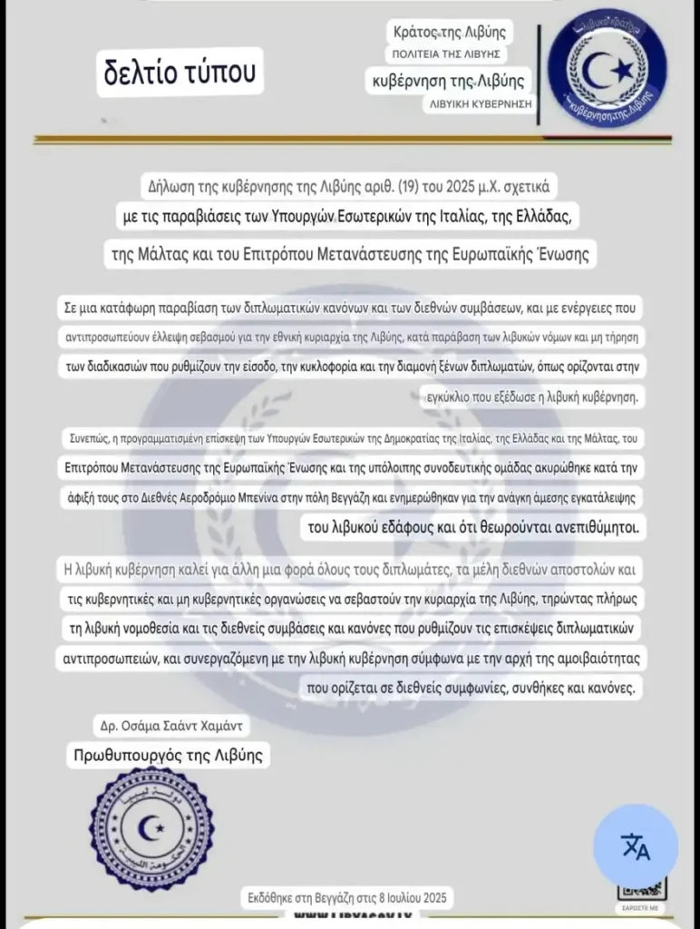 Ως ανεπιθύμητους εκδίωξε από την ανατολική Λιβύη τους εκπροσώπους της Ευρωπαϊκής Ένωσης – μεταξύ αυτών και τον Ελληνα υπουργό Μετανάστευσης και Ασύλου Θάνο Πλεύρη – το καθεστώς Χαφτάρ, που εξέδωσε ανακοίνωση στην οποία κάνει λόγο για υπερβάσεις των Υπουργών Εσωτερικών της Ιταλίας, της Ελλάδας, της Μάλτας και του Επιτρόπου Μετανάστευσης της ΕΕ.