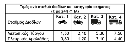 Τιμές ανά σταθμό διοδίων και κατηγορία οχήματος