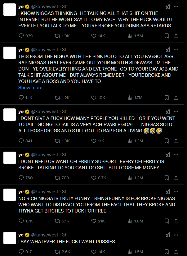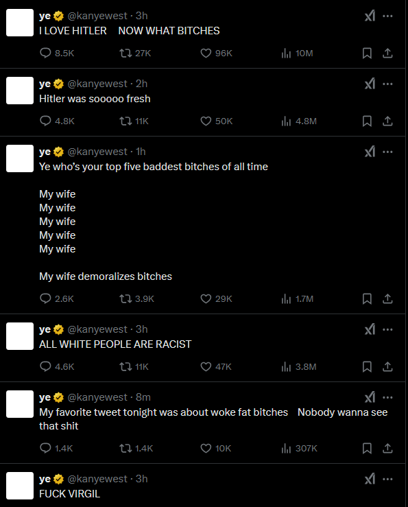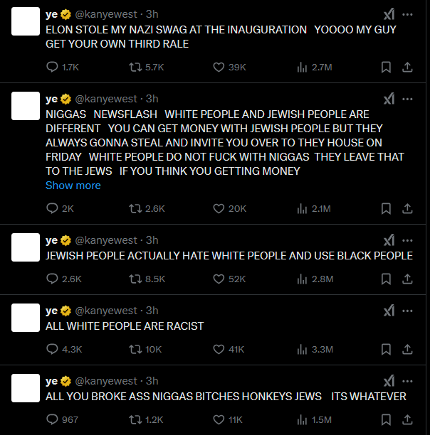 Kanye West in a series of tweets on X, he stated that he is a Nazi and he claimed he would “never trust or work with Jews again,” insisting he would “not apologize” for his views.