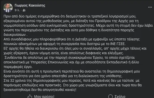 «Πριν από δύο ημέρες ενημερώθηκα ότι δεσμεύτηκαν οι τραπεζικοί λογαριασμοί μου, εξαιρουμένου αυτού της μισθοδοσίας μου, με διάταξη του Προέδρου της Αρχής για τη νομιμοποίηση εσόδων από εγκληματικές δραστηριότητες. Μέχρι αυτή τη στιγμή δεν έχω λάβει γνώση του περιεχομένου της Διάταξης και ούτε μου δόθηκε η δυνατότητα παροχής διευκρινίσεων.