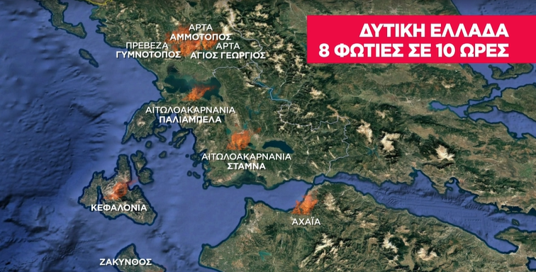 Σύμφωνα με τον εκπρόσωπο Τύπου της ΠΥ συνολικά 106 φωτιές στην επικράτεια έχουν εκδηλωθεί στην ελληνική επικράτεια. Στην Δυτική Ελλάδα τα ενεργά μέτωπα καίνε σε Πρέβεζα, Άρτα, Αιτωλοακαρνανία, Κεφαλονιά και Αχαΐα.